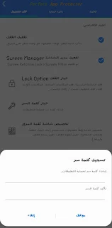 - وعند الضغط على خيار الإعدادات سوف تتمكن من إعداد كلمة سر لقفل التطبيقات كما تظهر في الصورة